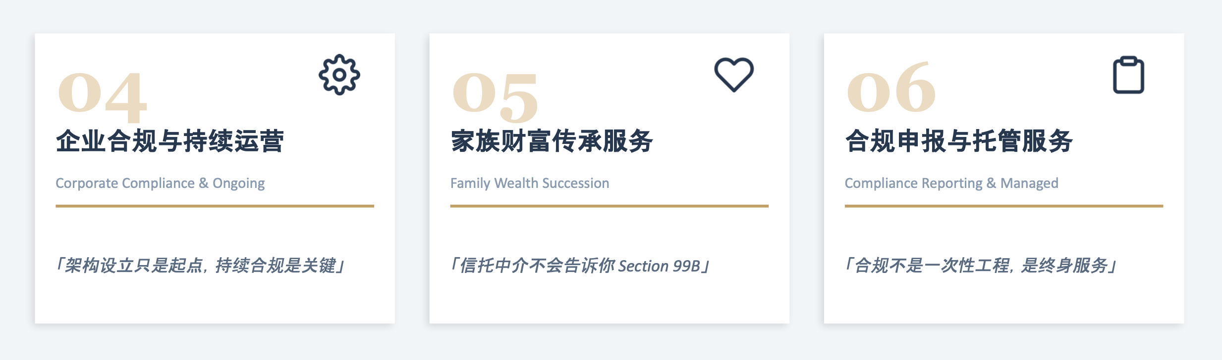 我们可以帮你从高净值家庭到出海企业,提供量身定制的合规方案
